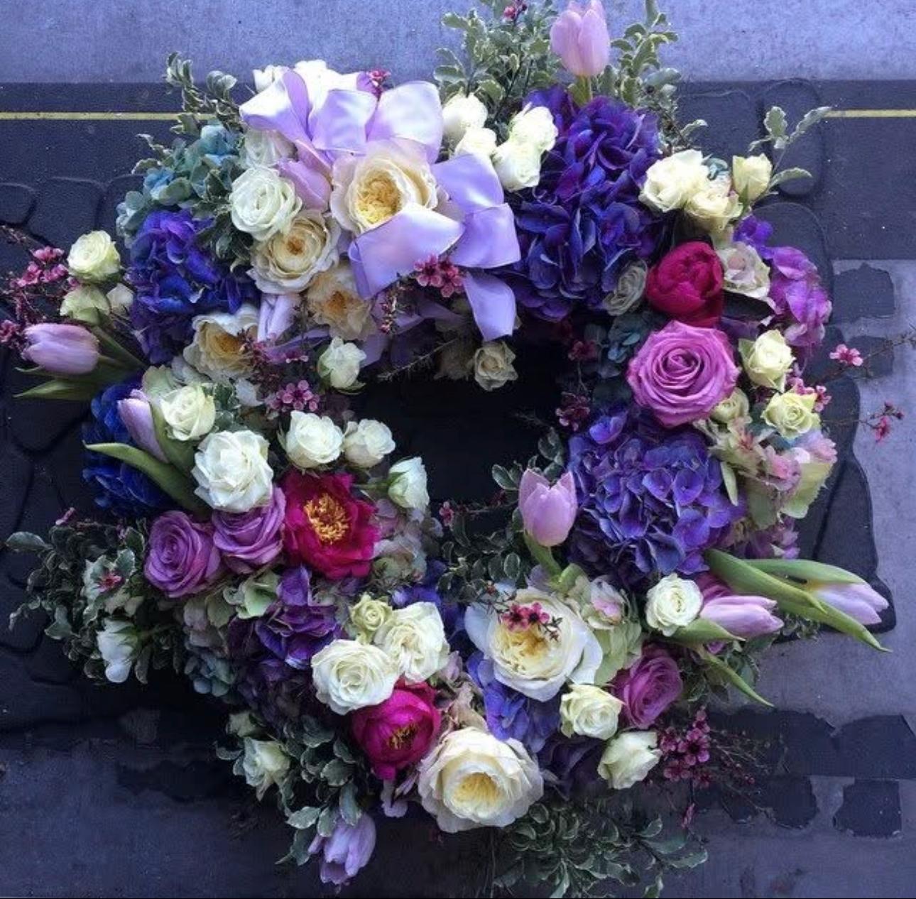 Each wreath is custom-designed with seasonal blooms and artistic balance.