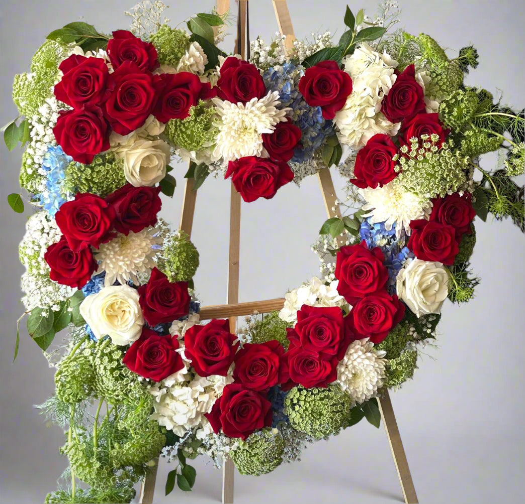 Honor a beautiful soul with this custom heart-shaped funeral spray, thoughtfully designed with seasonal farm-fresh flowers in a powerful red, white, and blue color palette. This patriotic celebration of life wreath is a heartfelt tribute perfect for memorials, military services, and anyone who lived with passion, strength, and love for their country.