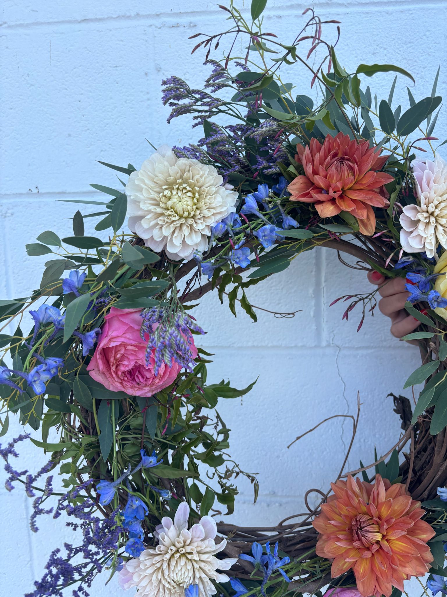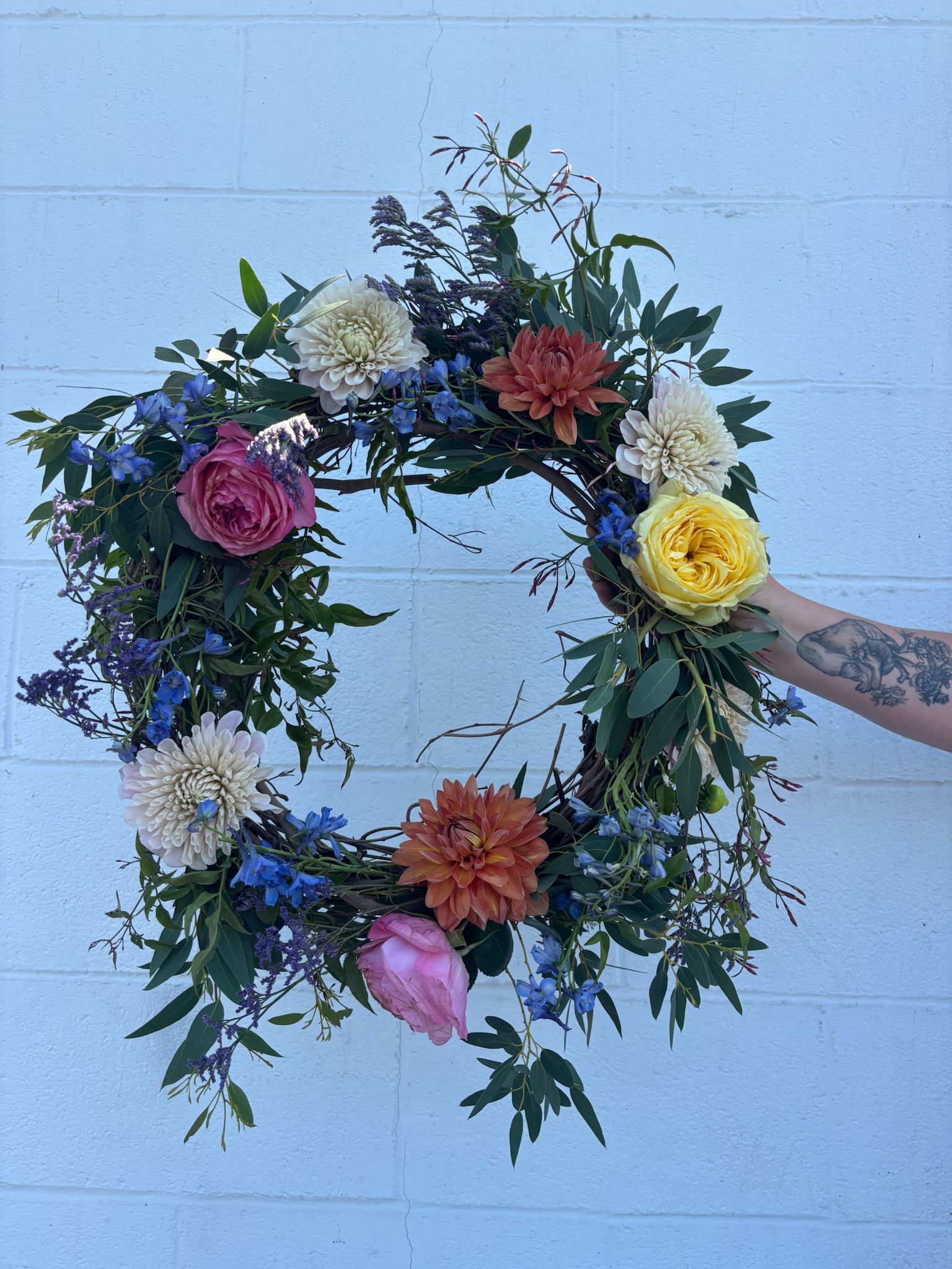 • Coral dahlias, creamy white chrysanthemums, yellow garden roses, blue delphinium, blush ranunculus, lavender sprigs & soft eucalyptus