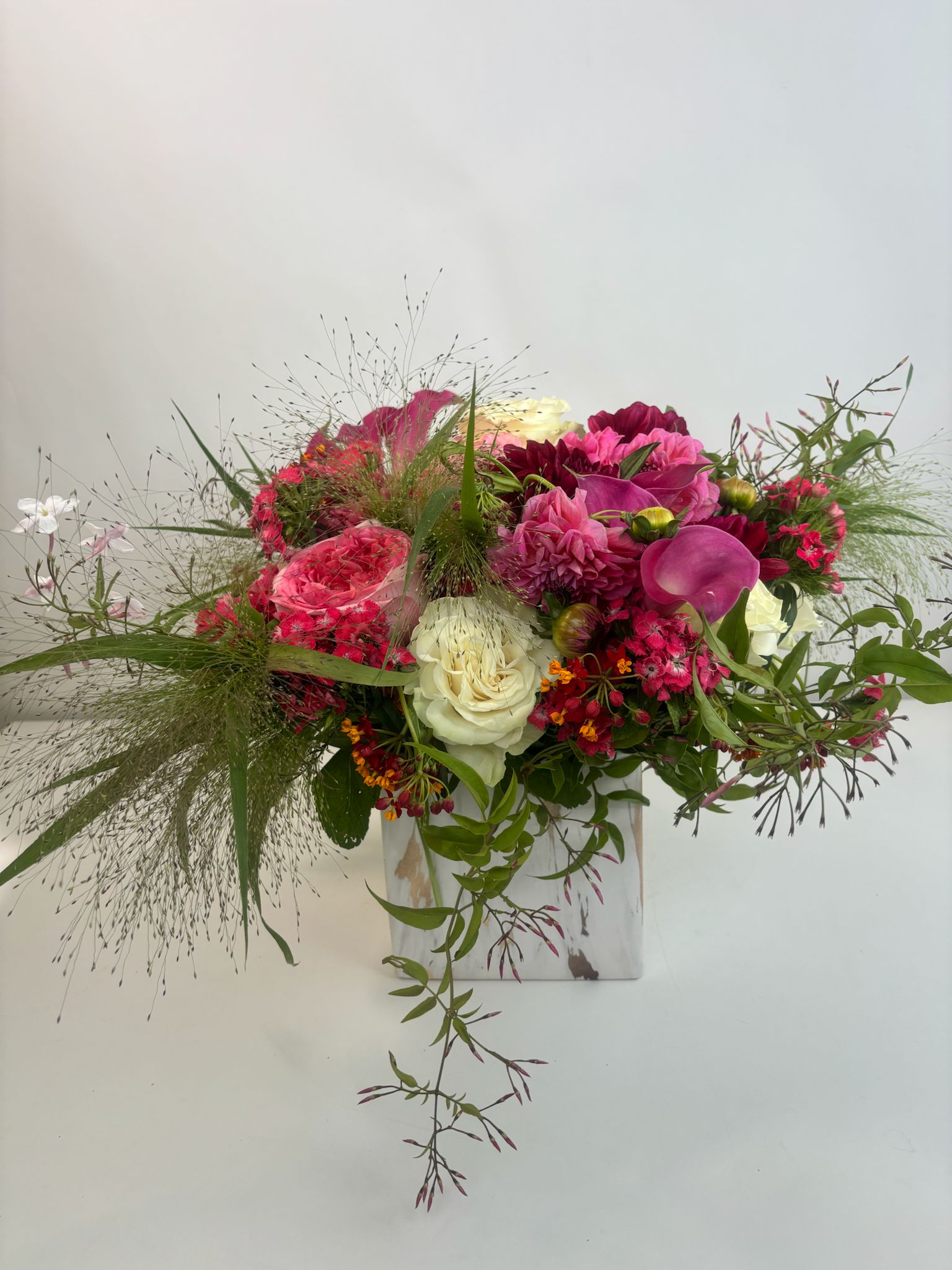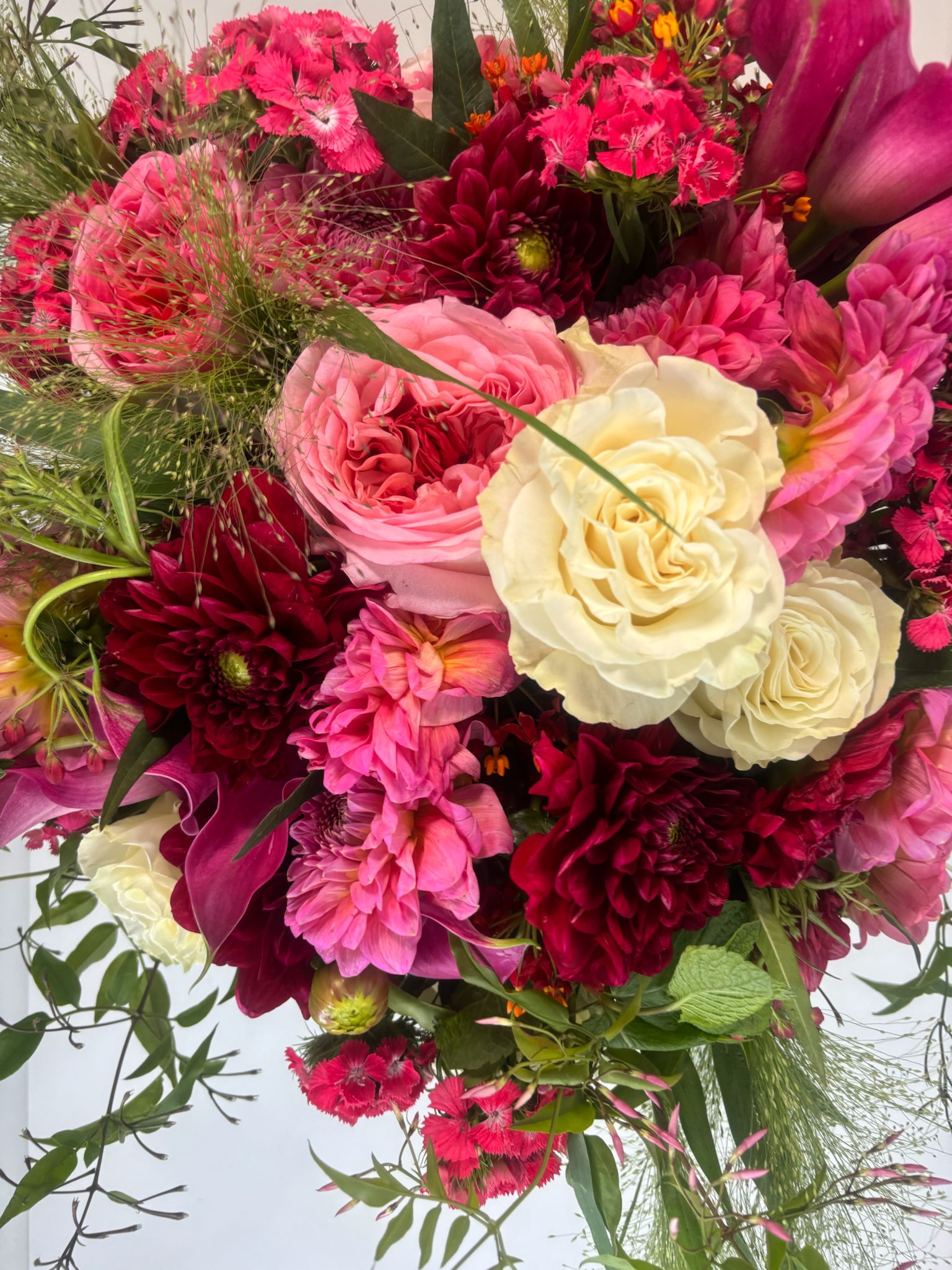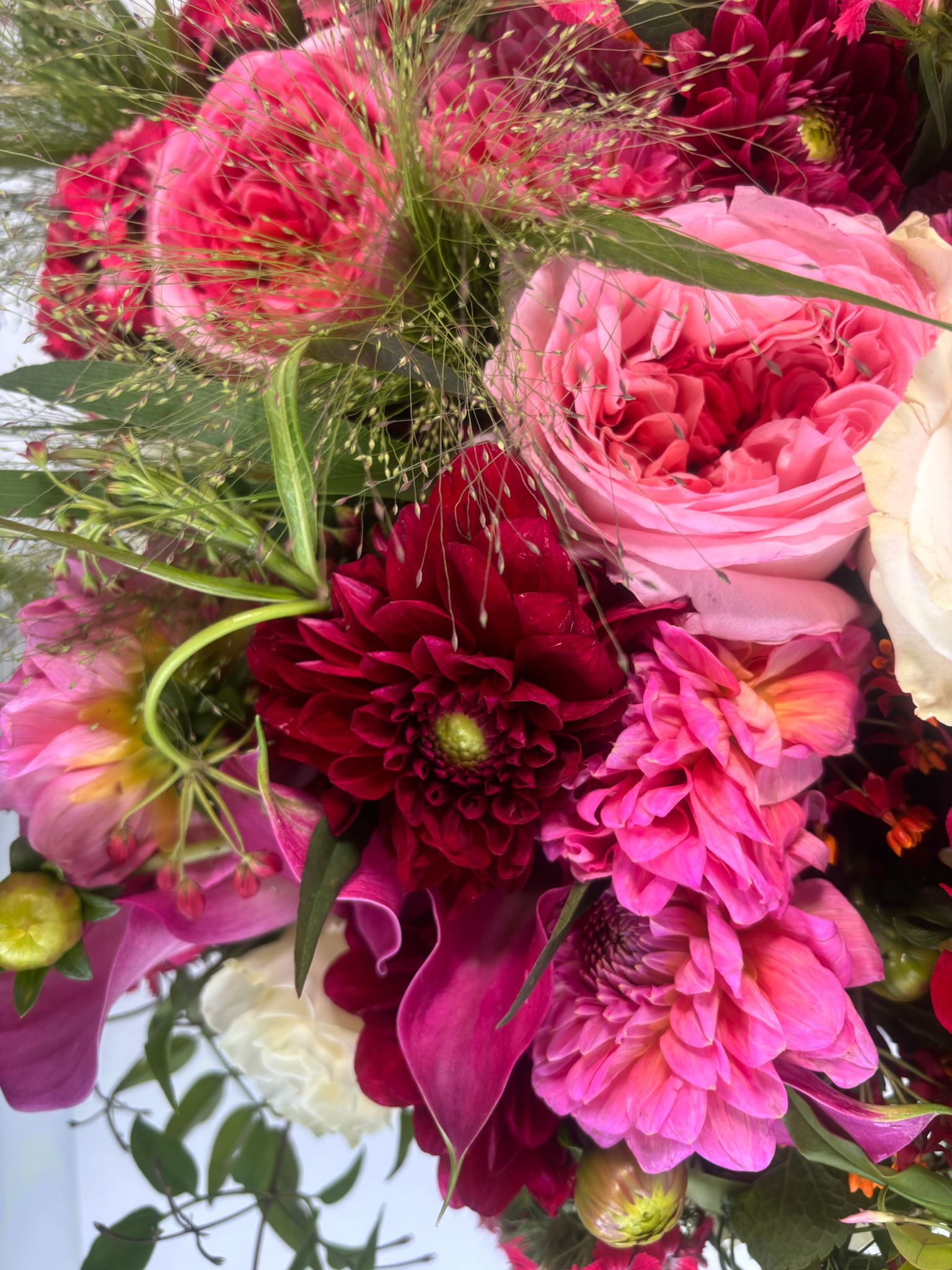 This lush 15” x 15” arrangement is a breathtaking symphony of color and texture, radiating richness, elegance, and heartfelt intention. Layers of deep burgundy dahlias, magenta calla lilies, creamy garden roses, and vibrant pink blooms come together in perfect harmony, creating a piece that feels both powerful and graceful.