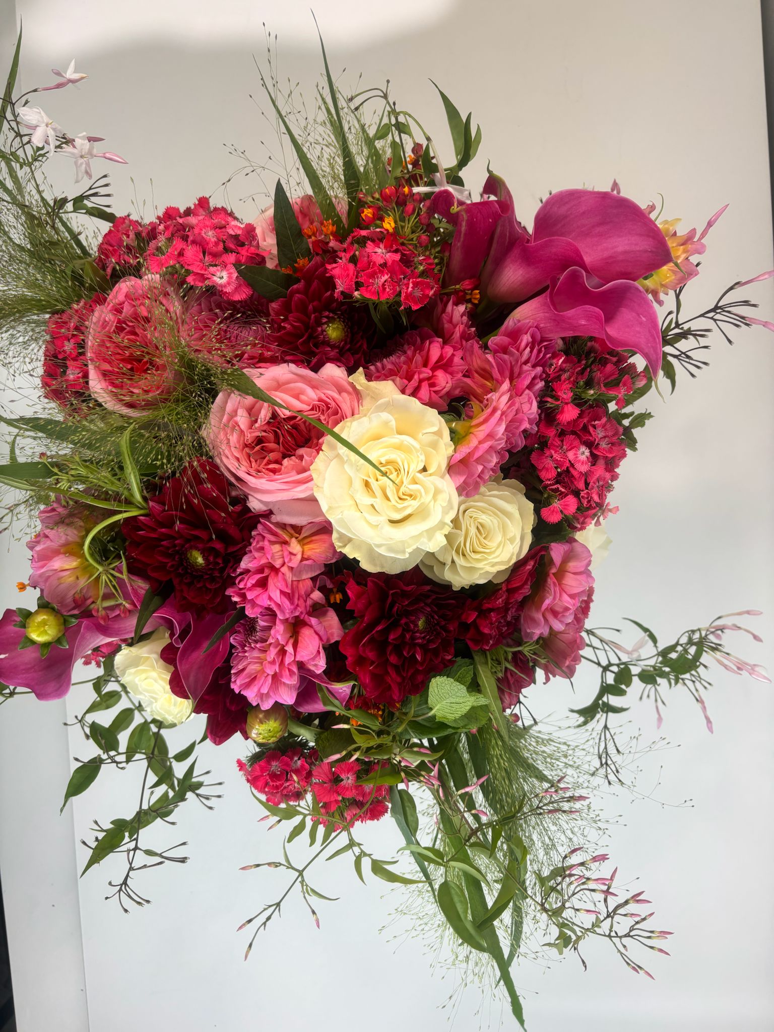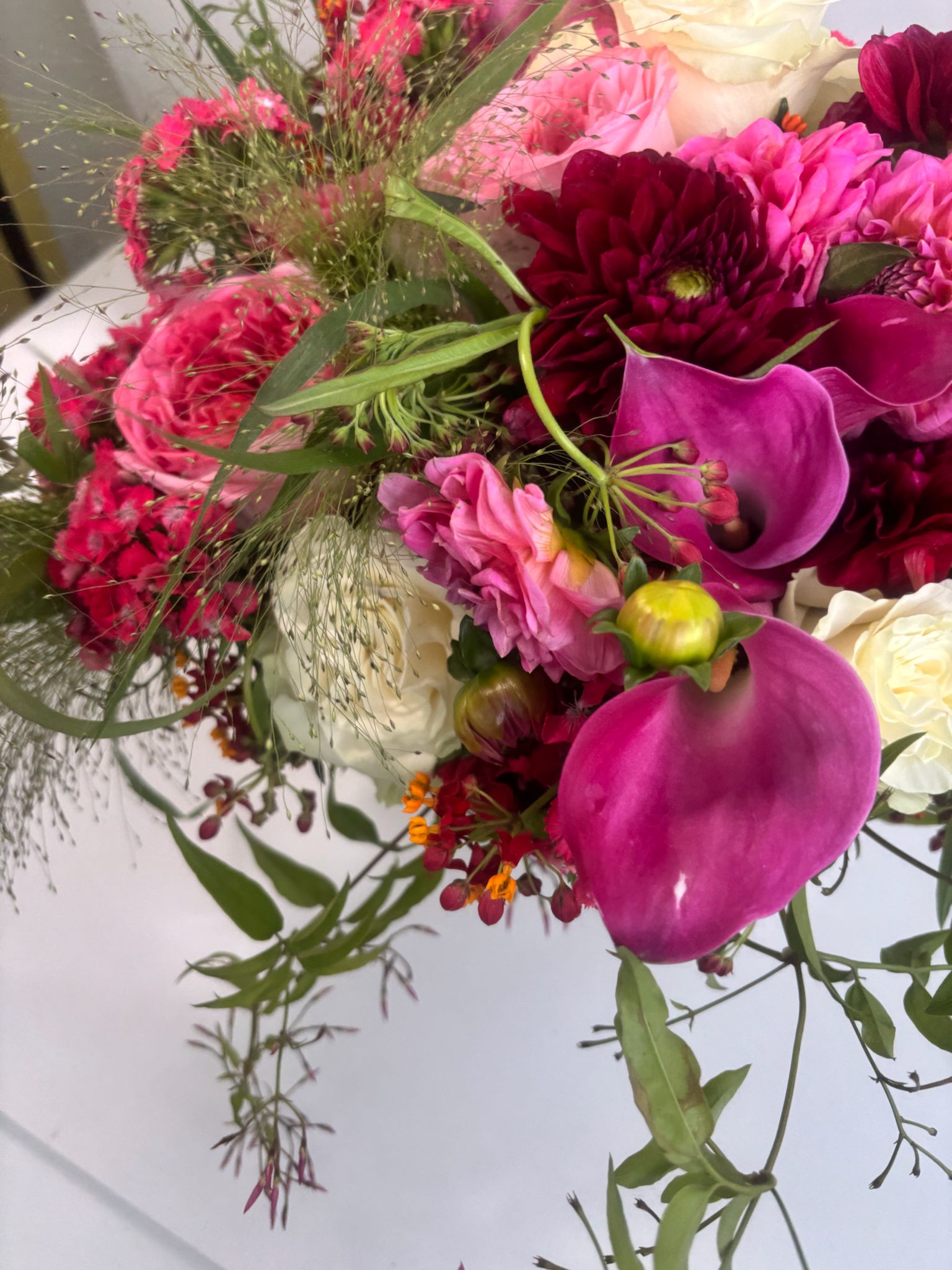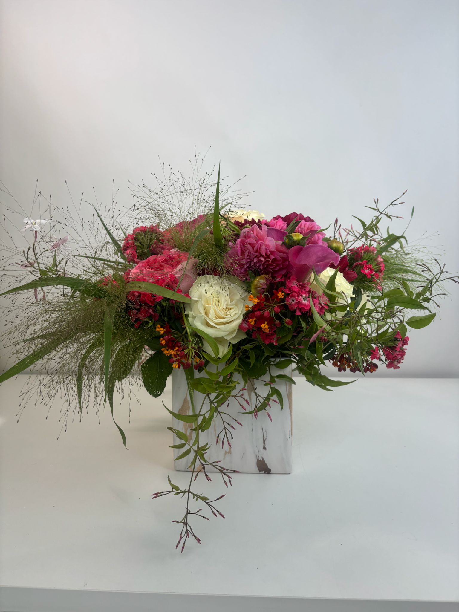 This lush 15” x 15” arrangement is a breathtaking symphony of color and texture, radiating richness, elegance, and heartfelt intention. Layers of deep burgundy dahlias, magenta calla lilies, creamy garden roses, and vibrant pink blooms come together in perfect harmony, creating a piece that feels both powerful and graceful.