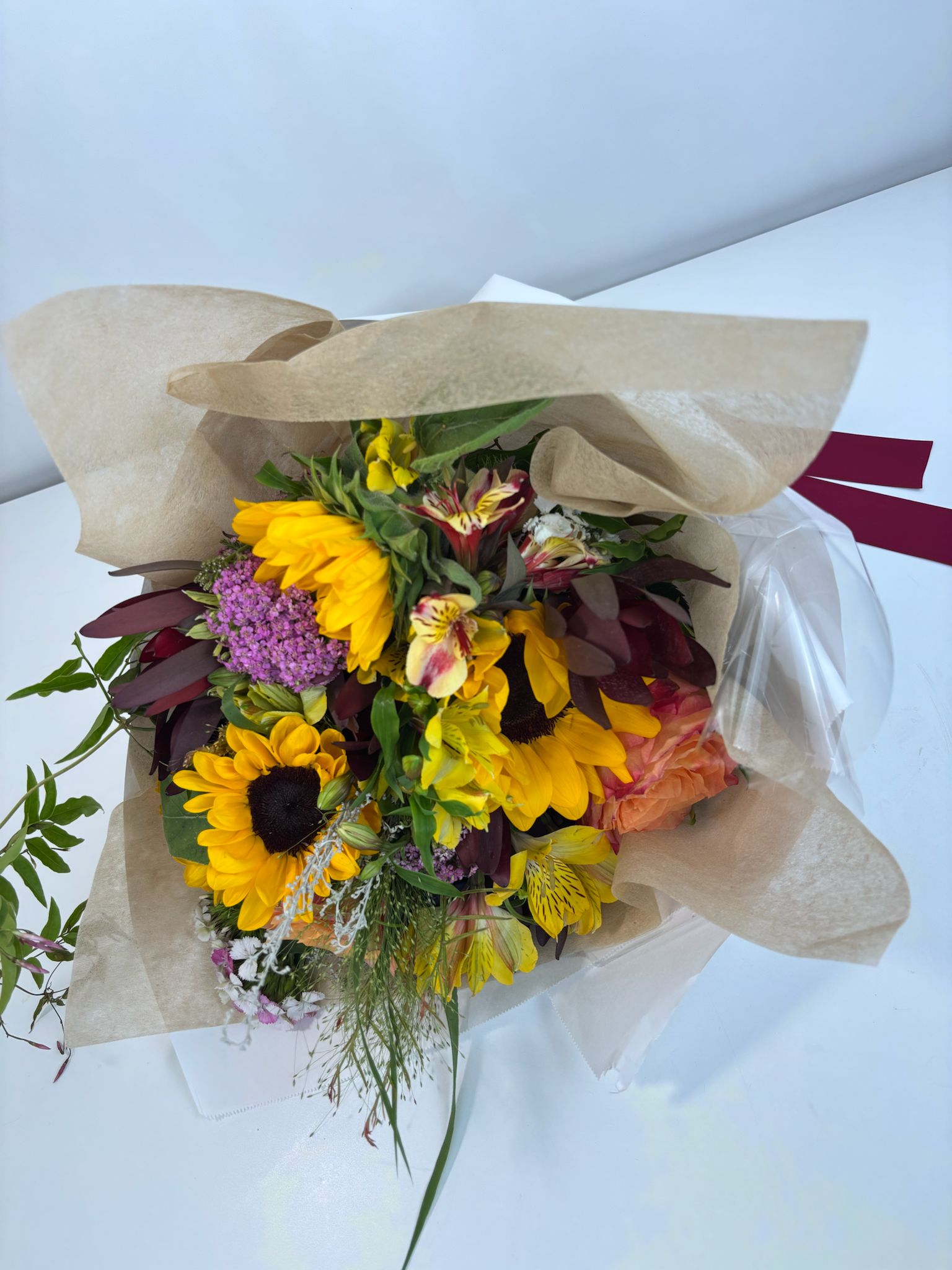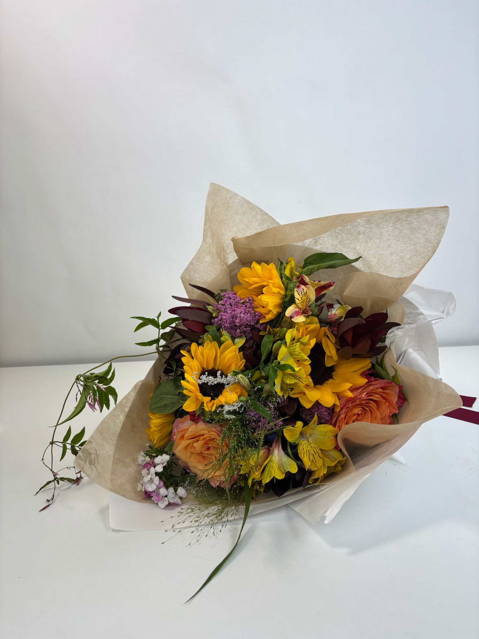 Celebrate the magic of autumn with our Fall Fresh Farm Direct Wrap Bouquet, hand-designed with the season’s most radiant blooms. Bursting with golden sunflowers, vibrant yellow alstroemeria, fiery orange roses, and pops of purple yarrow, this bouquet is wrapped in natural kraft paper for that farm-to-table feel.