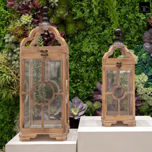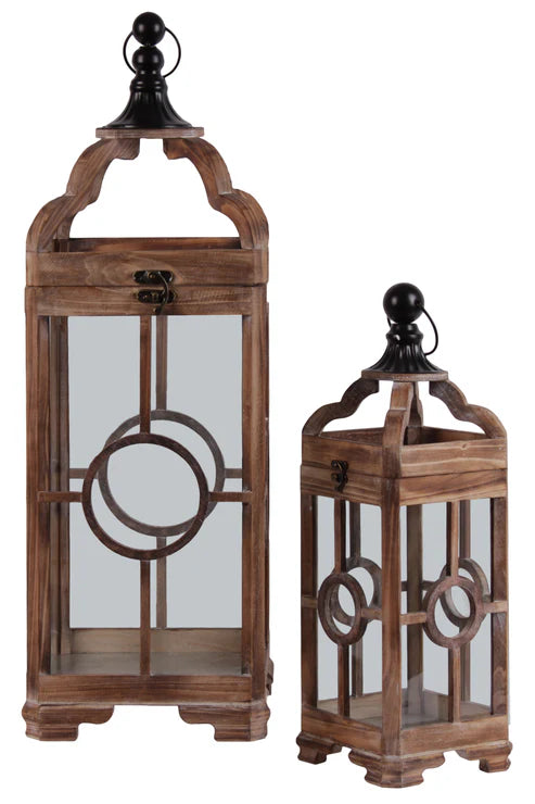 Briselle Square Wood Lanterns bring understated charm with their natural finish, elegant metal finials, and distinctive circle-accented design.