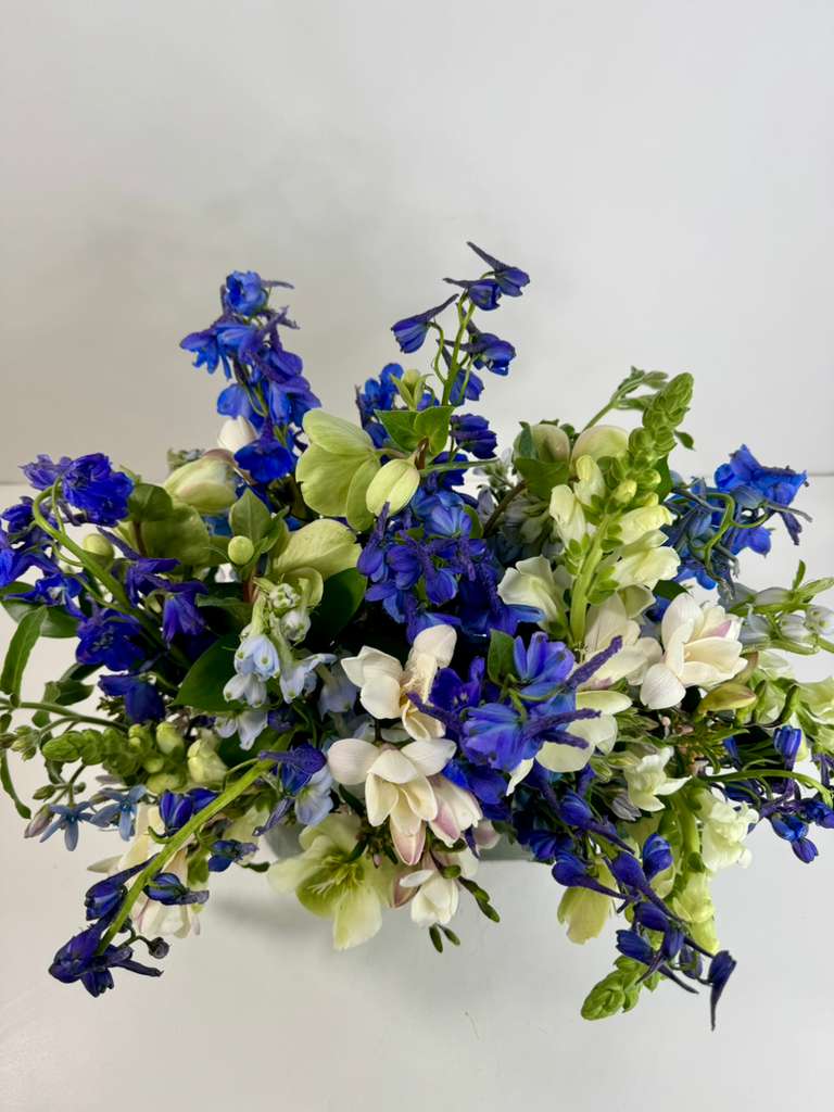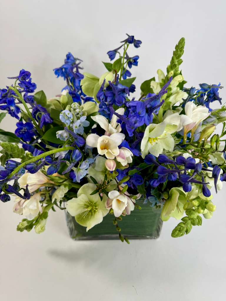 This lush, garden-style design blends rich sapphire blue delphinium with creamy white freesia, soft green hellebore, delicate snapdragon, and seasonal spring textures. Arranged in a sleek glass cube wrapped in layered green aspidistra leaf, it feels fresh, structured, and wildly organic at the same time.
