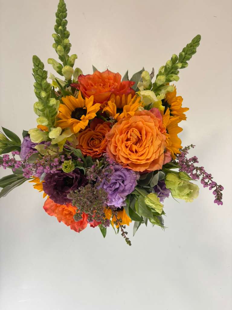 This vibrant spring arrangement is designed to wish happiness, good energy, and positive momentum. Bursting with golden sunflowers, radiant orange roses, soft lavender lisianthus, fresh green snapdragons, and seasonal accent blooms, JOY feels alive, optimistic, and full of heart.