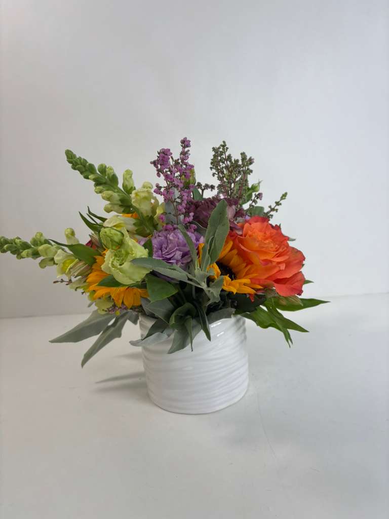 Every color in this design was chosen to uplift. The yellows spark happiness, the oranges celebrate confidence and creativity, and the purples bring balance and calm. Set in a clean white ceramic vessel, JOY feels modern, warm, and joyful without trying too hard.