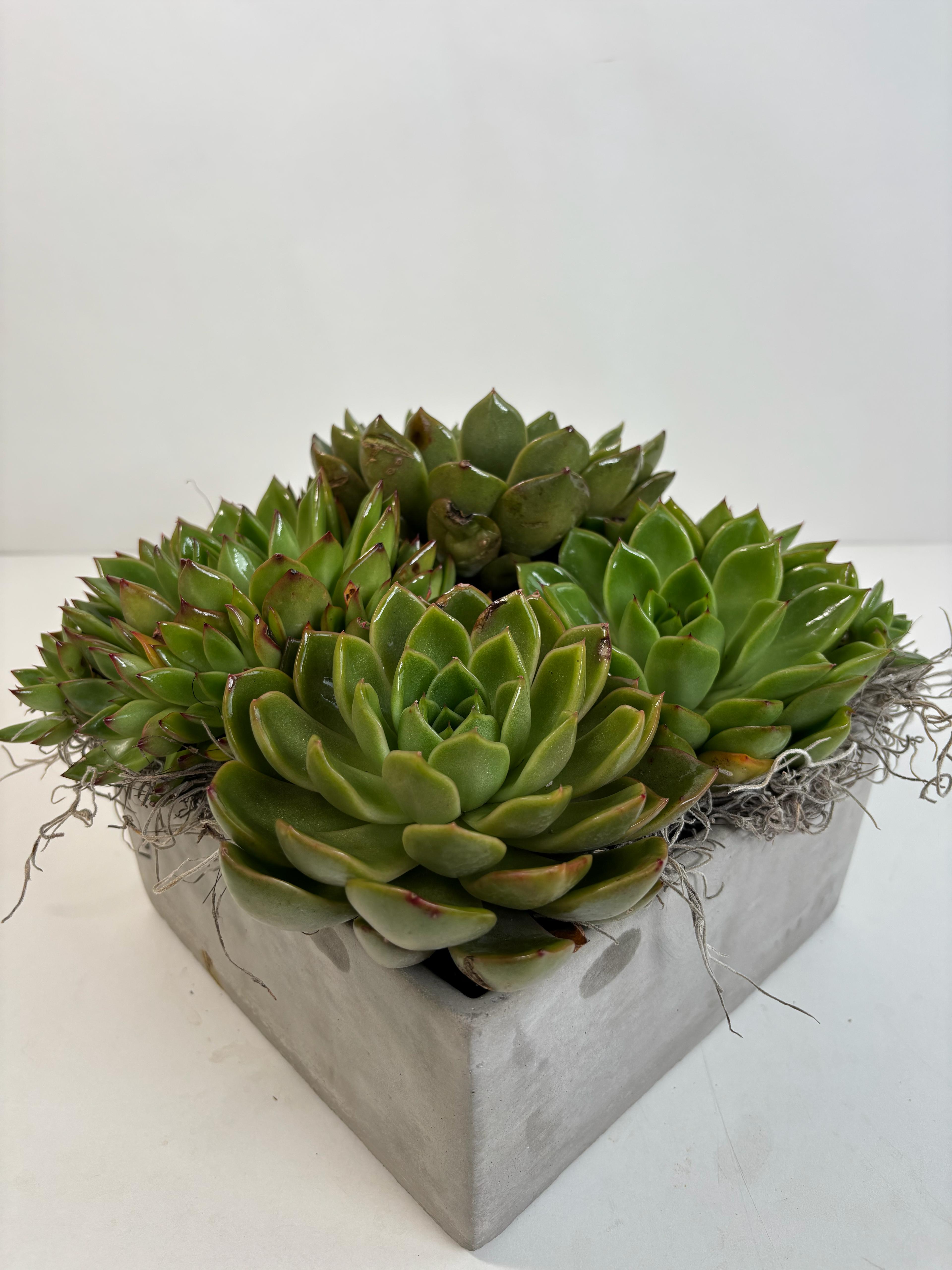 Designed in a sleek concrete container and filled with lush, full rosettes, this arrangement brings a touch of calm, grounding energy into any home or workspace. Succulents are known for being hard to kill, making this the ideal gift for beginners, busy schedules, offices, or anyone who wants something gorgeous without the upkeep.