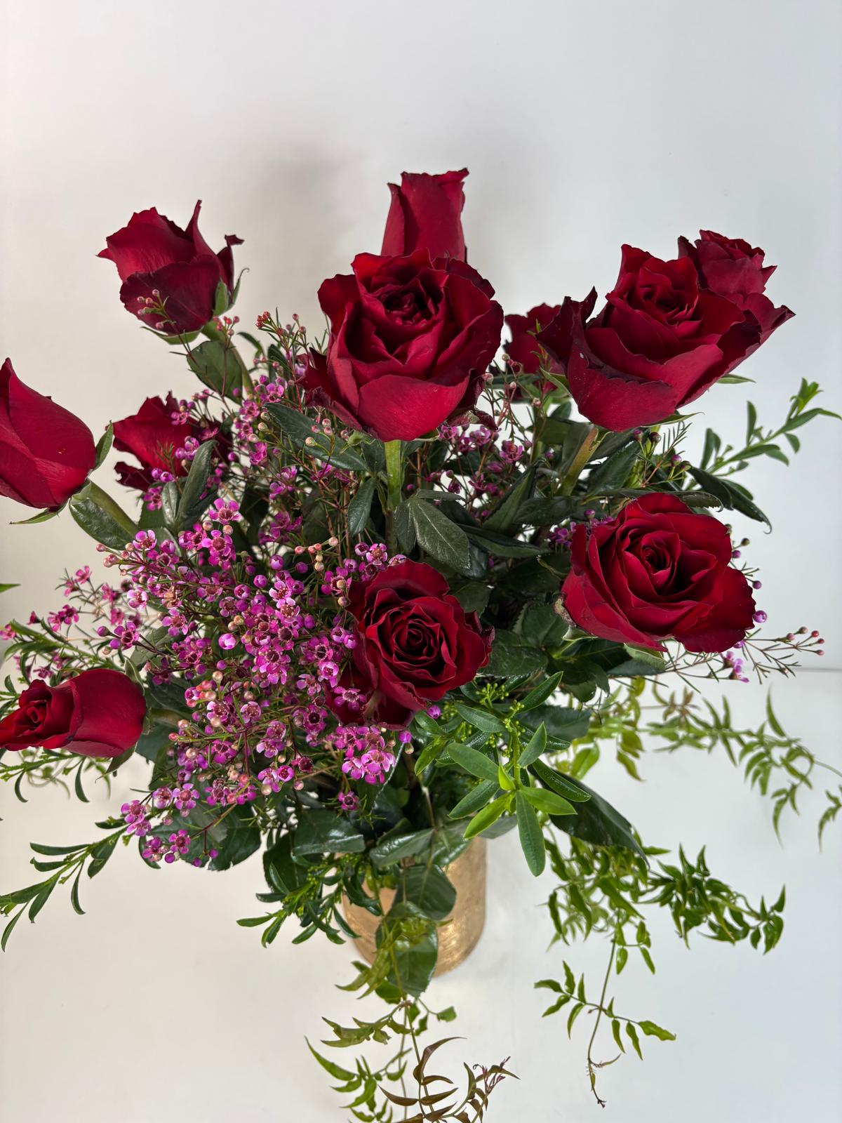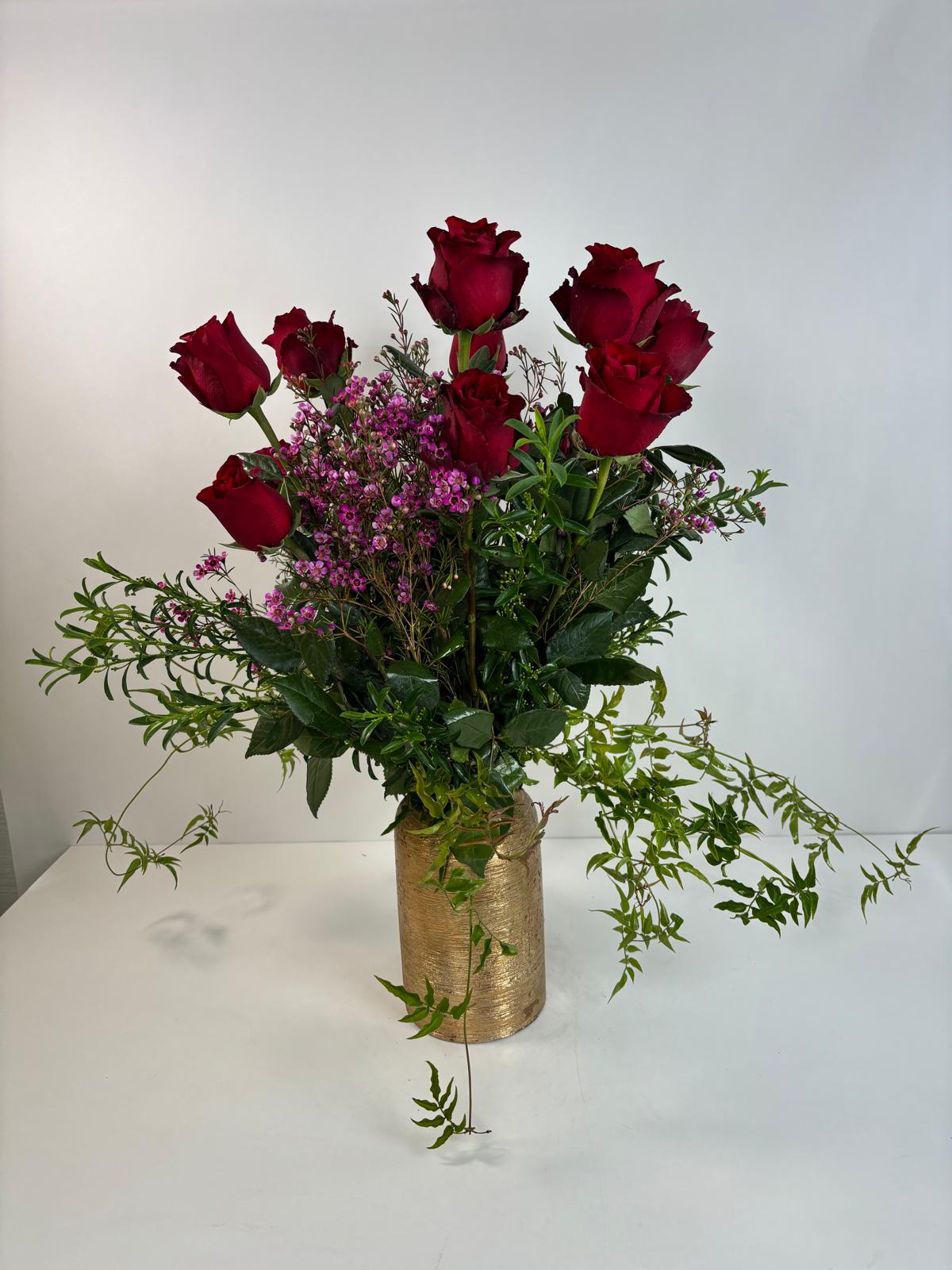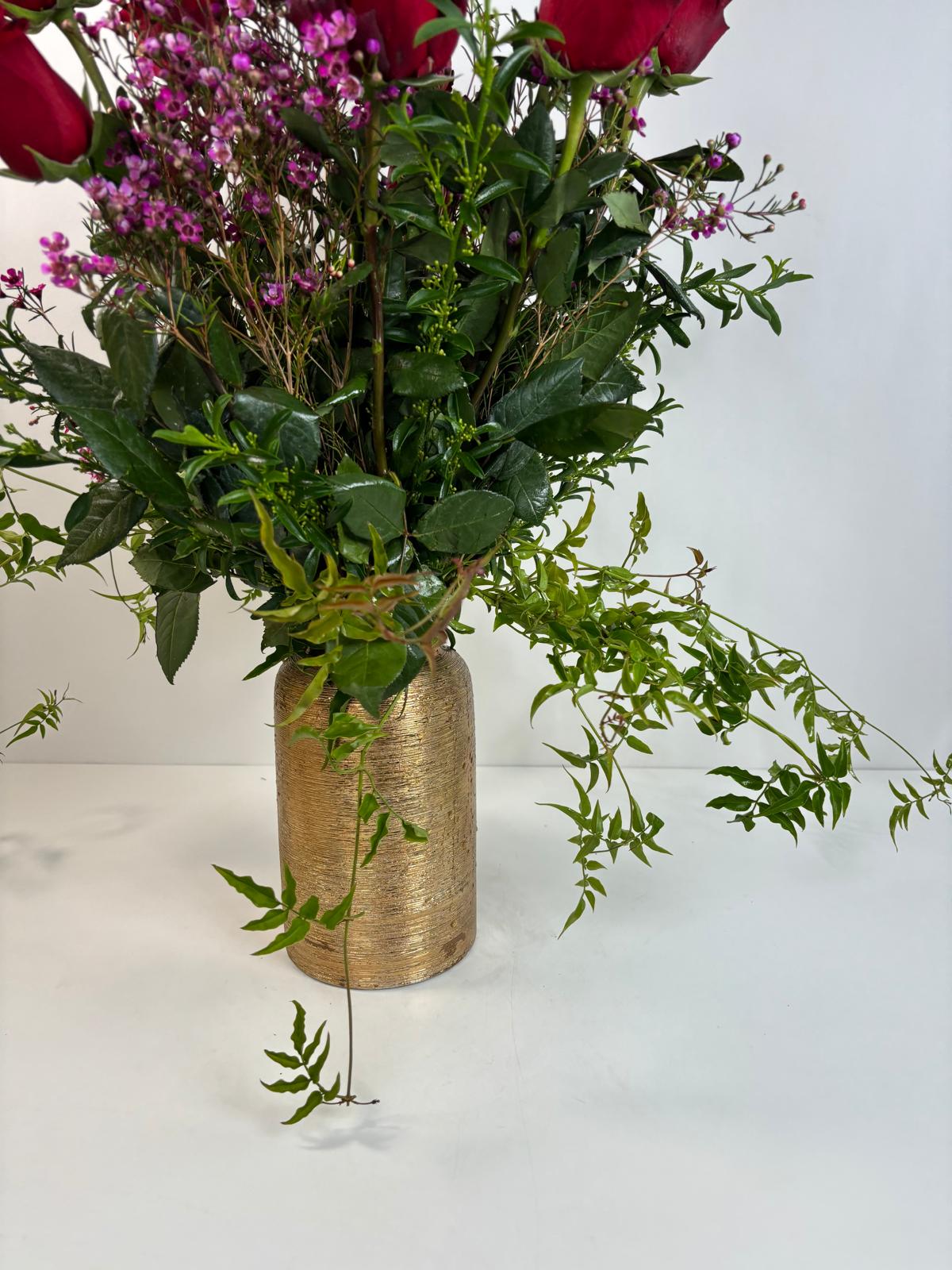 A Dozen Red Roses in Our Signature Gold Collection Vase