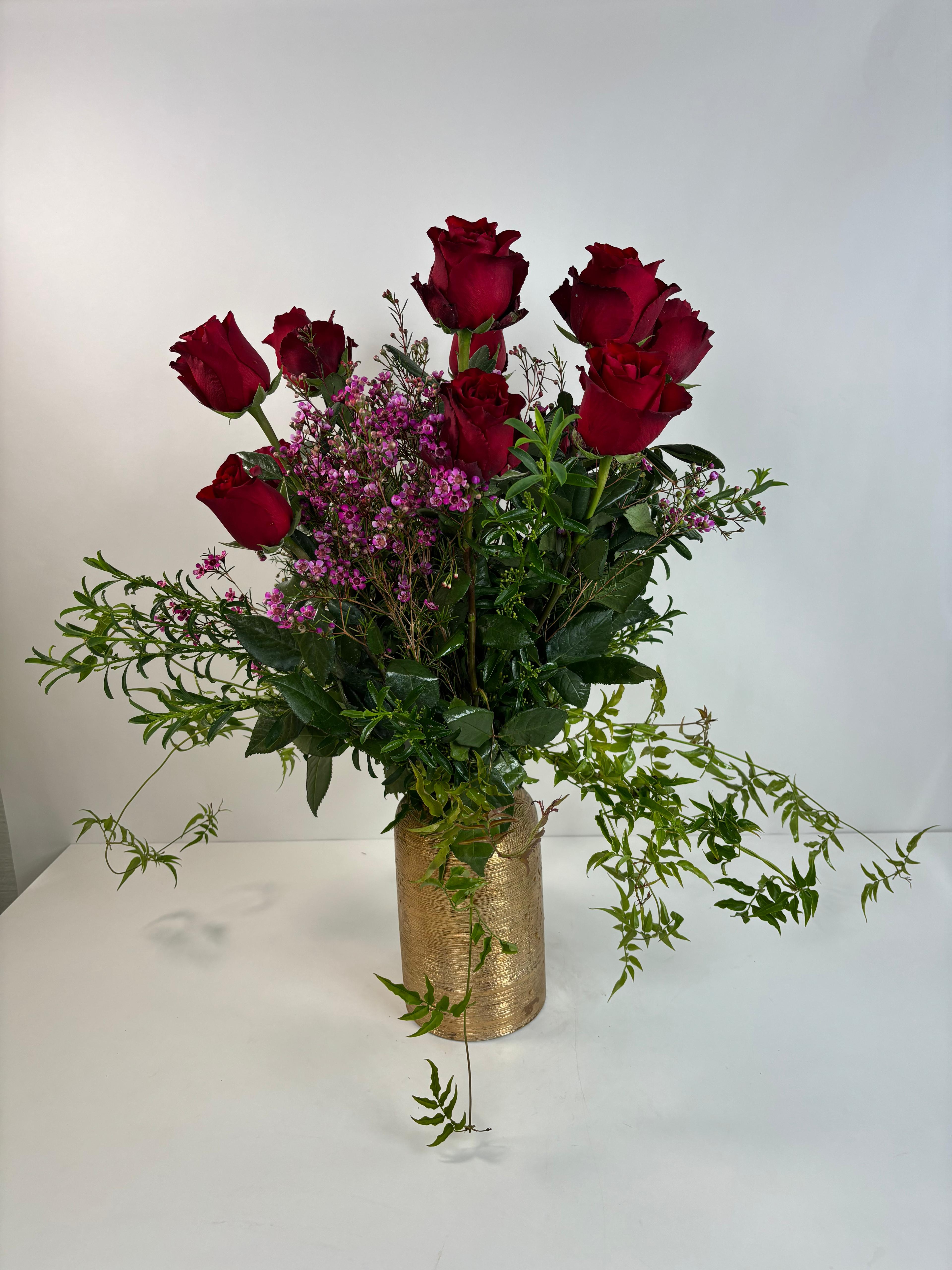 Designed in our signature Gold Collection vase, this tall arrangement brings a regal presence to any room — bold, romantic, and unforgettable.