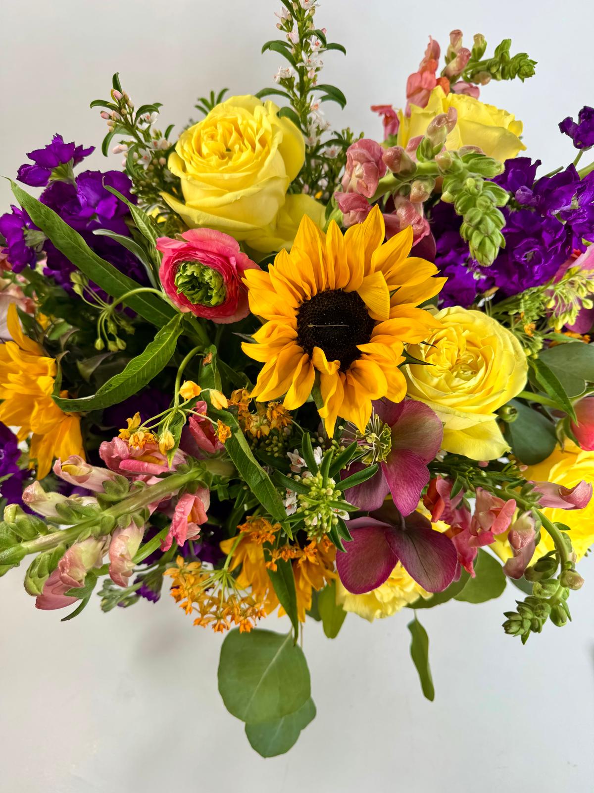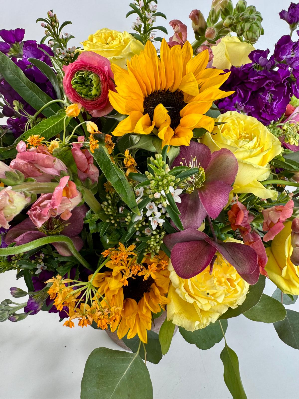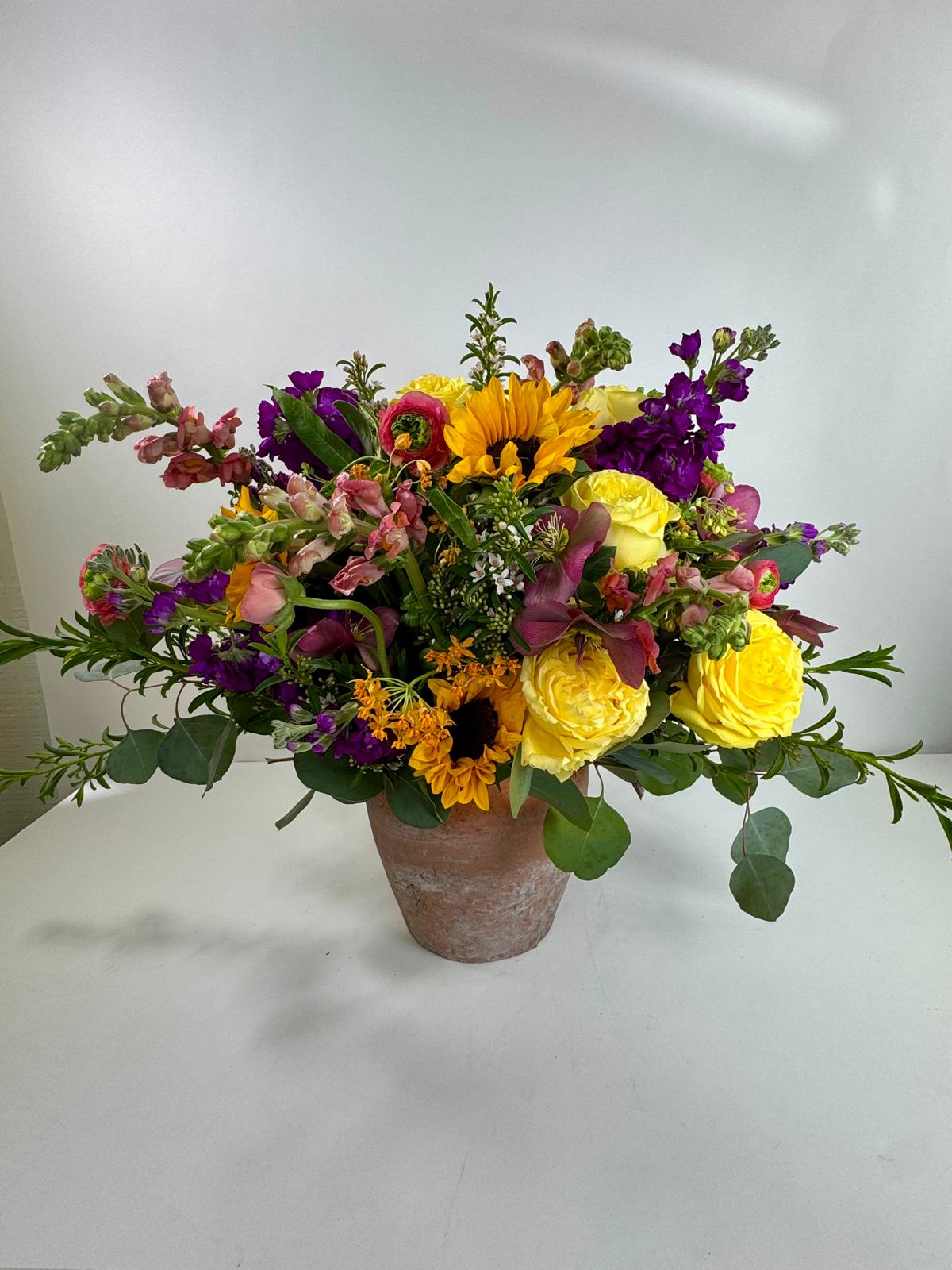 Designed in a rustic terracotta pot, this lush garden-style floral arrangement features radiant sunflowers, buttery yellow roses, jewel-toned ranunculus, snapdragons, stock, hellebores, seasonal wildflowers, and fresh eucalyptus greens. Every stem is intentionally placed to feel organic, abundant, and alive.