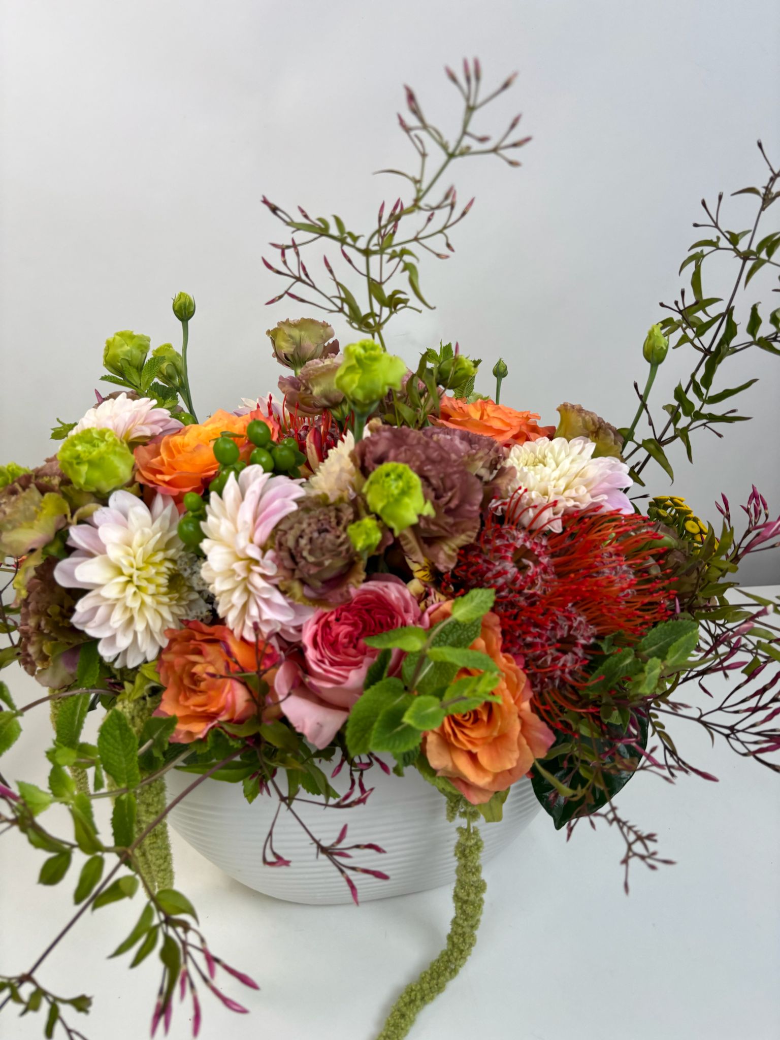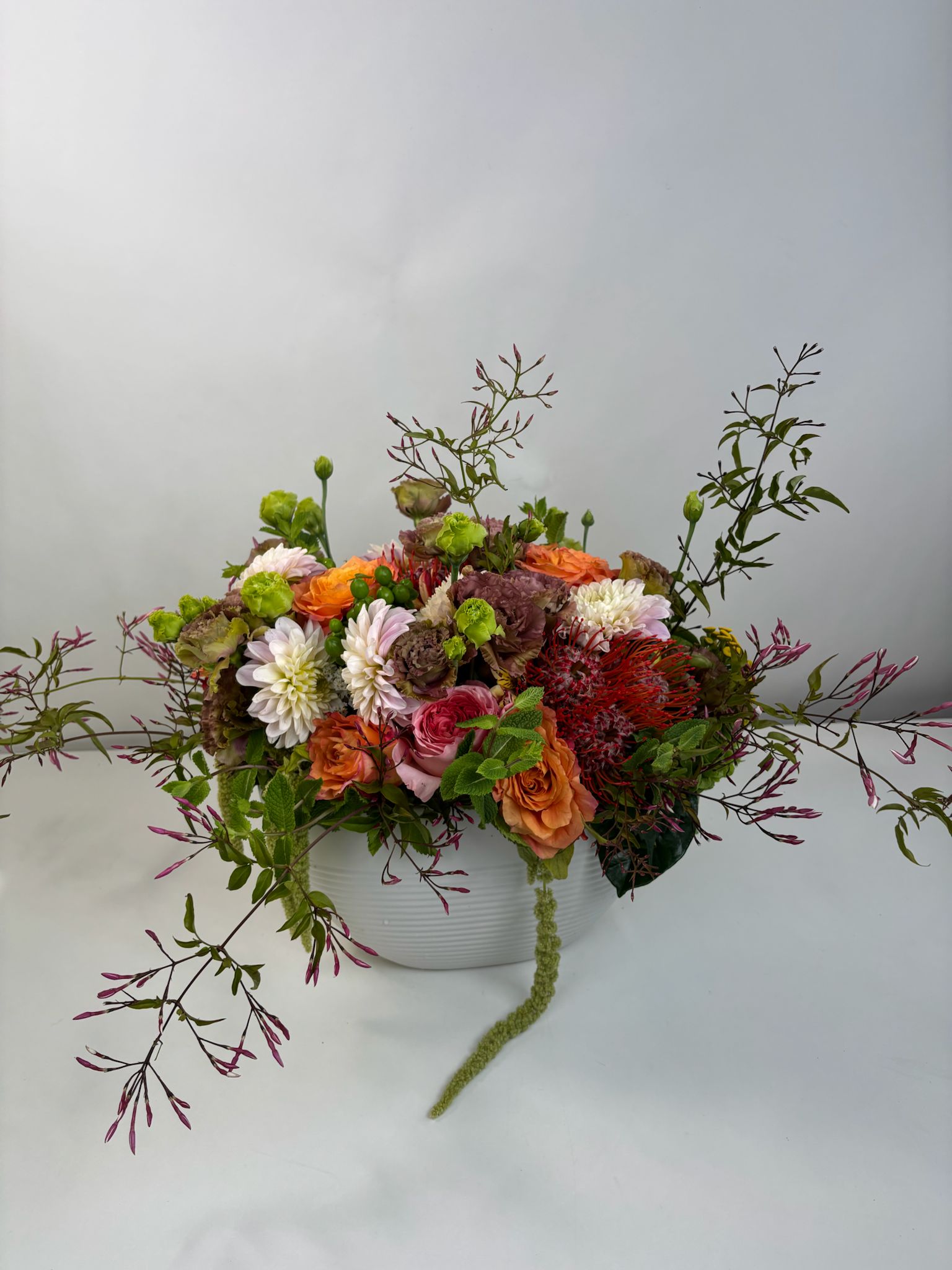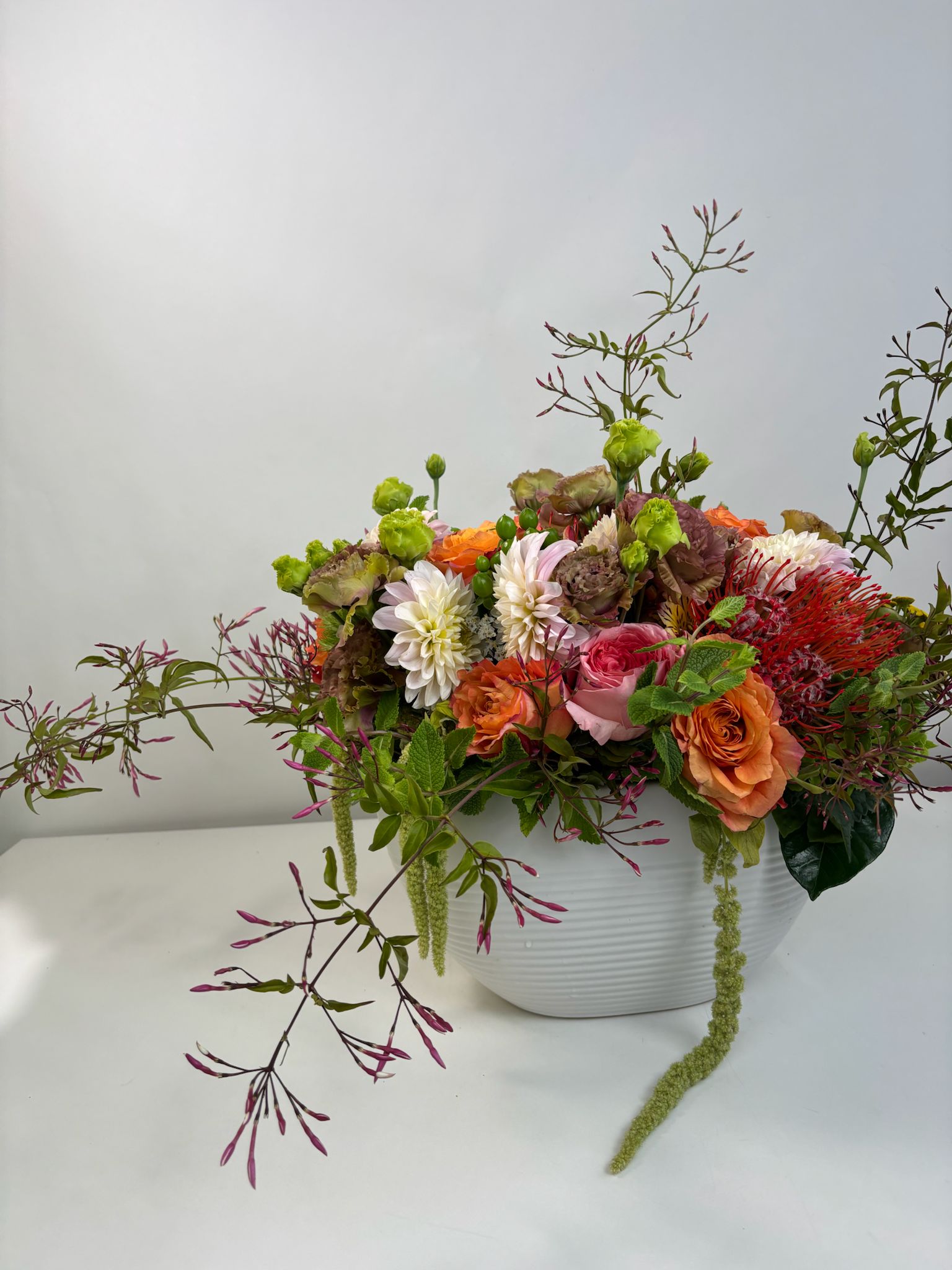 These lisianthus are in season now and at their most magnificent—each petal soft and full of movement, like velvet poetry. Paired with fresh farm-direct flowers and gathered in a wide modern ceramic container, this piece feels like a blooming garden at golden hour.