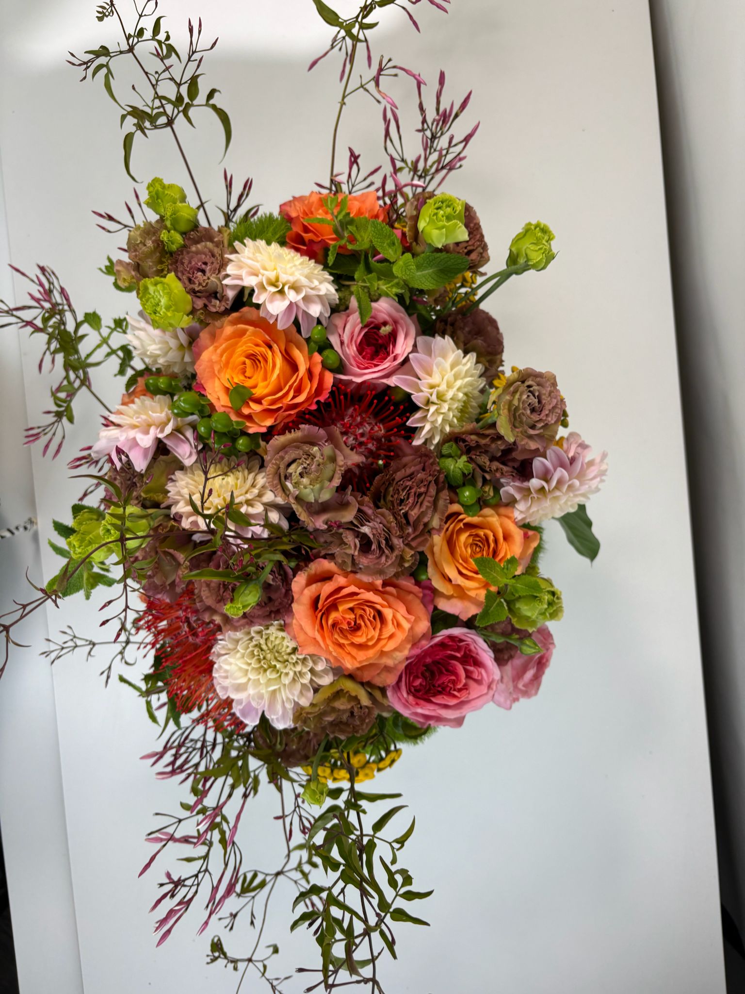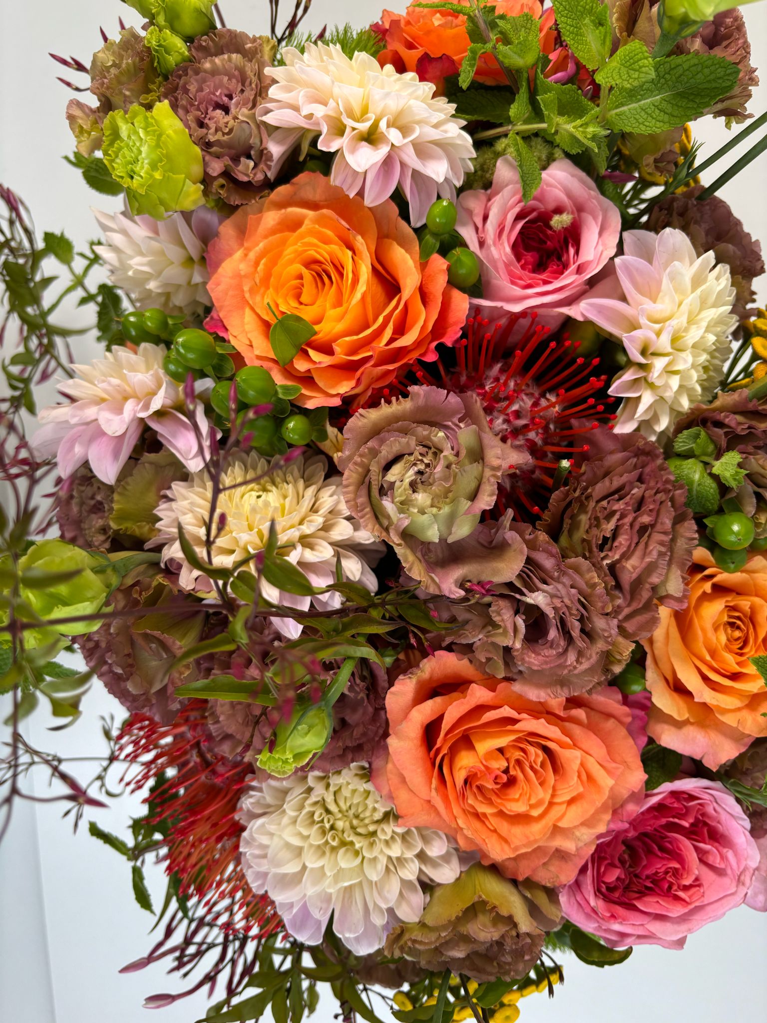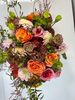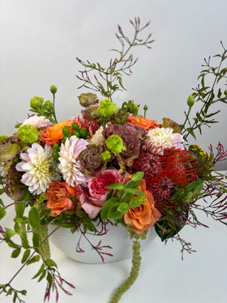 Introducing our Summer Soul Bloom – a breathtaking, handcrafted arrangement celebrating the peak season of the most spectacular lisianthus blooms. Designed with a vibrant mix of earthy mocha lisianthus, creamy café dahlias, coral garden roses, mint sprigs, and striking pincushion proteas, this showstopper is overflowing with color, texture, and soul.
