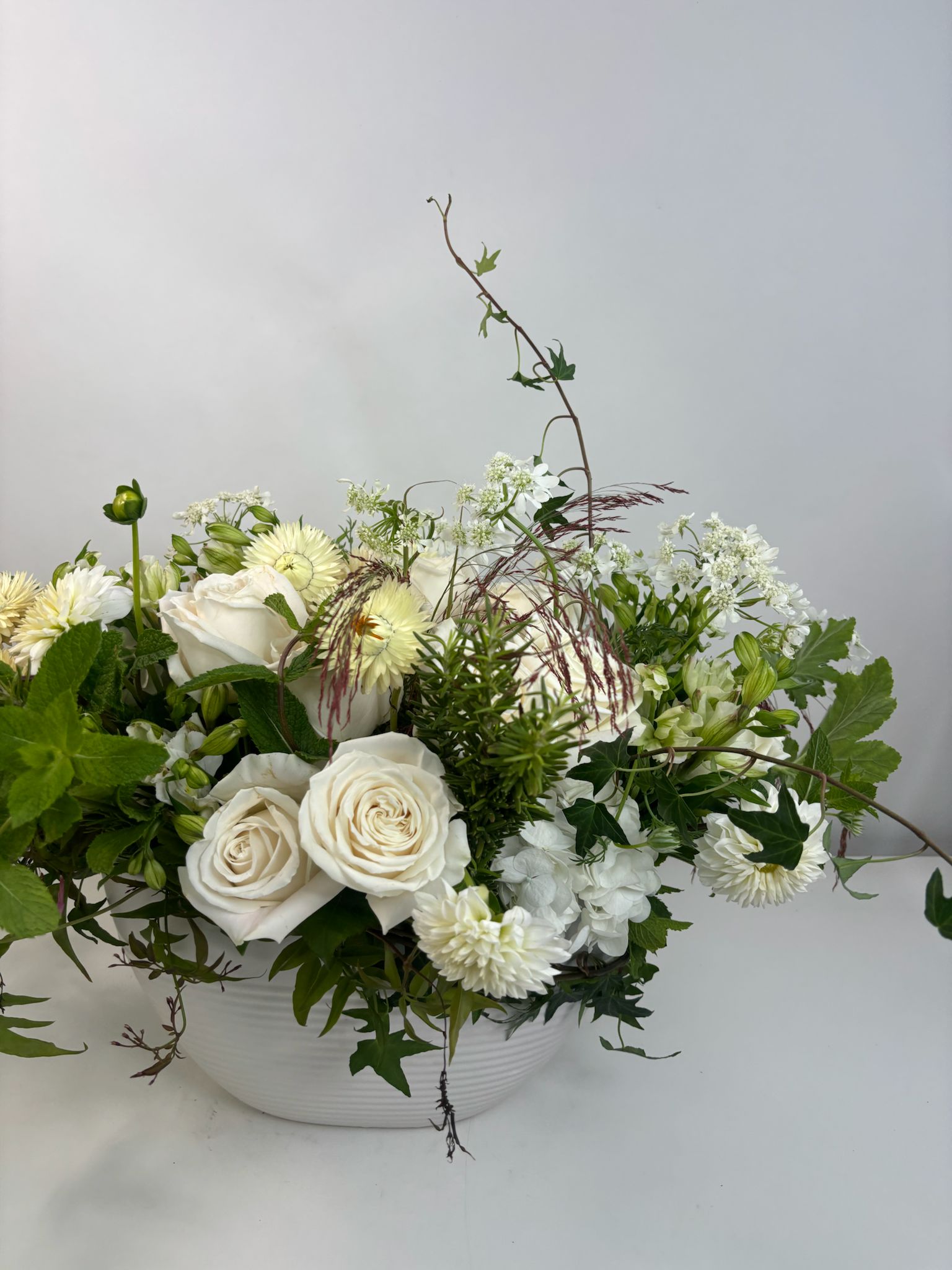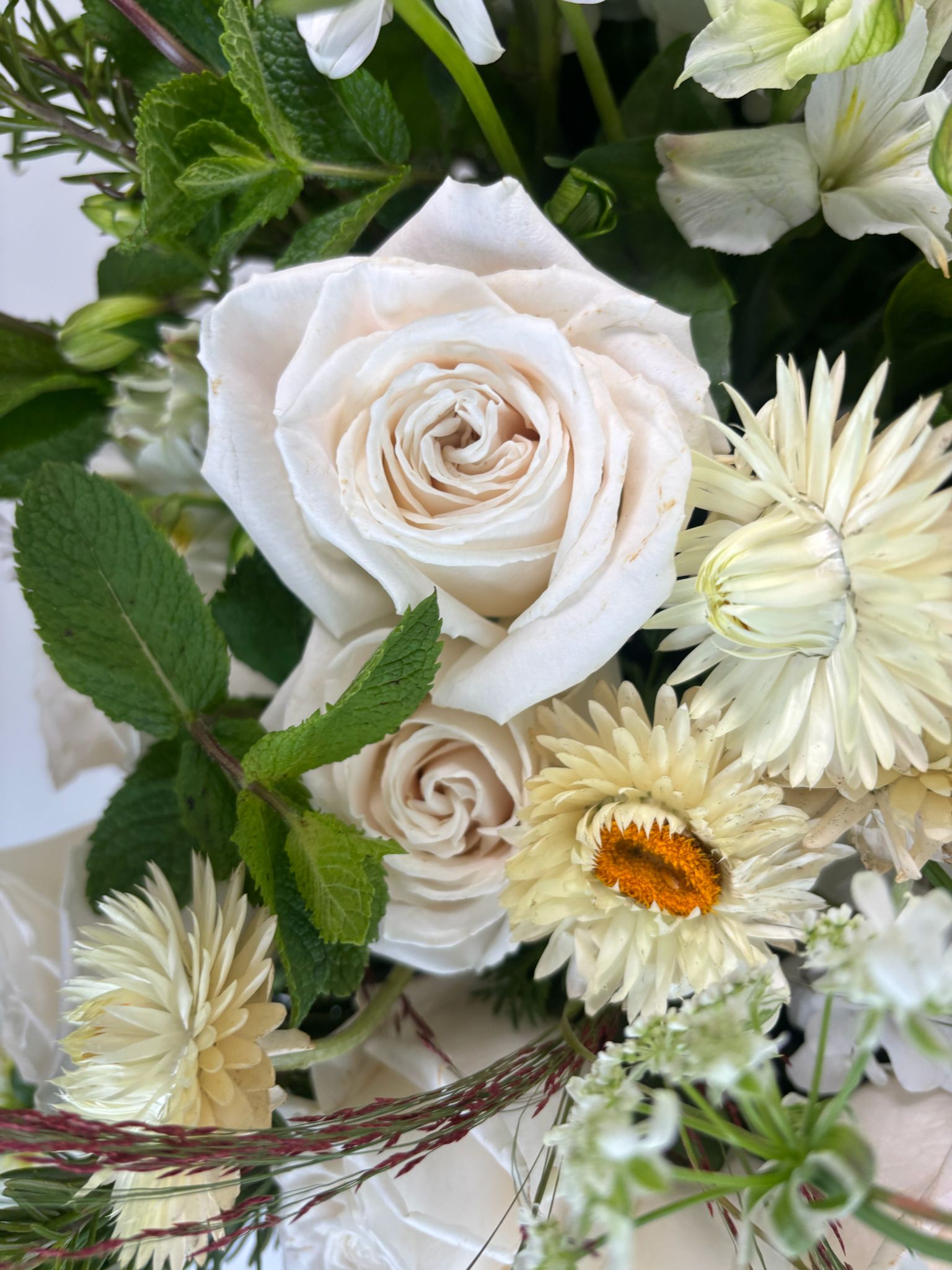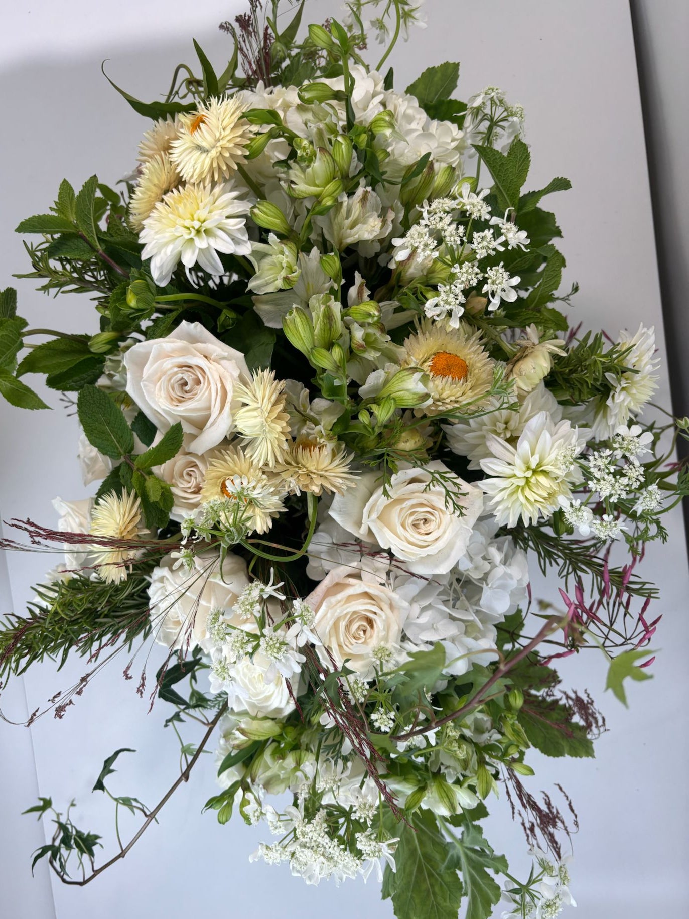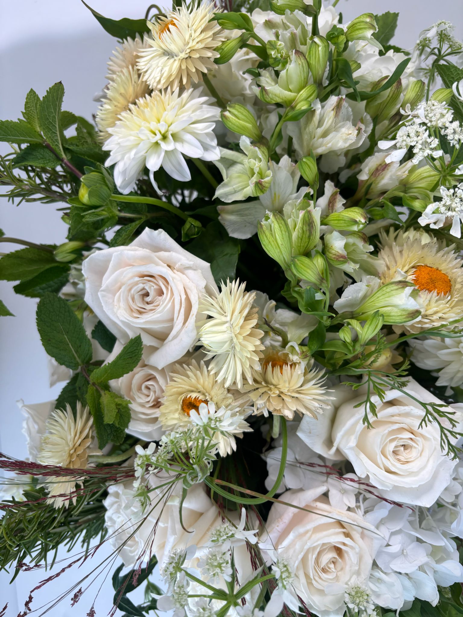Overflowing with soft ivory roses, delicate strawflowers, creamy white dahlias, mint sprigs, hydrangea, jasmine vines, and queen anne’s lace — this design is an ethereal dance of texture, light, and movement. Its organic shape and fresh-from-the-garden vibe make it perfect for: