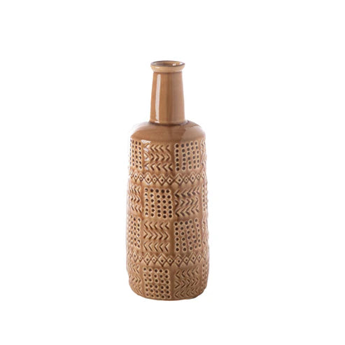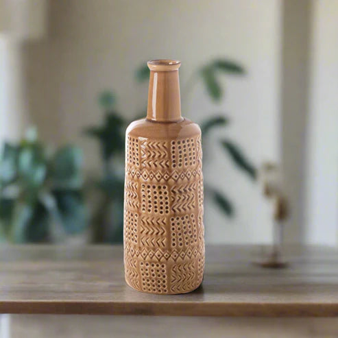 The Zarien Layered Tribal Ceramic Vase brings depth and global-inspired texture to your space with its tall bottle silhouette and intricate layered tribal pattern. Finished in a sleek gloss, the vase’s bold design pairs well with both neutral and statement interiors. Available in three size options, Zarien works beautifully as a solo piece or styled in a group for visual height and rhythm.
