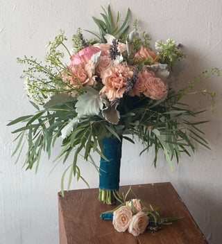 Elevate your special day with a gorgeous bridal bouquet and matching boutonnière featuring blush seasonal flowers, greenery, and delicate hints of white and lavender.