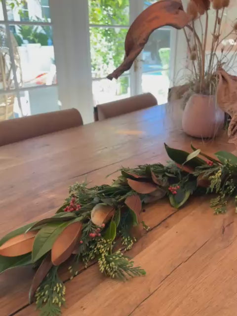 Our Magnolia, Cedar & Berry Garland is designed to bring warmth and beauty to every corner of your home. Each garland is handcrafted with lush magnolia, soft cedar, and bright berries for a luxurious, festive look that feels both timeless and modern.